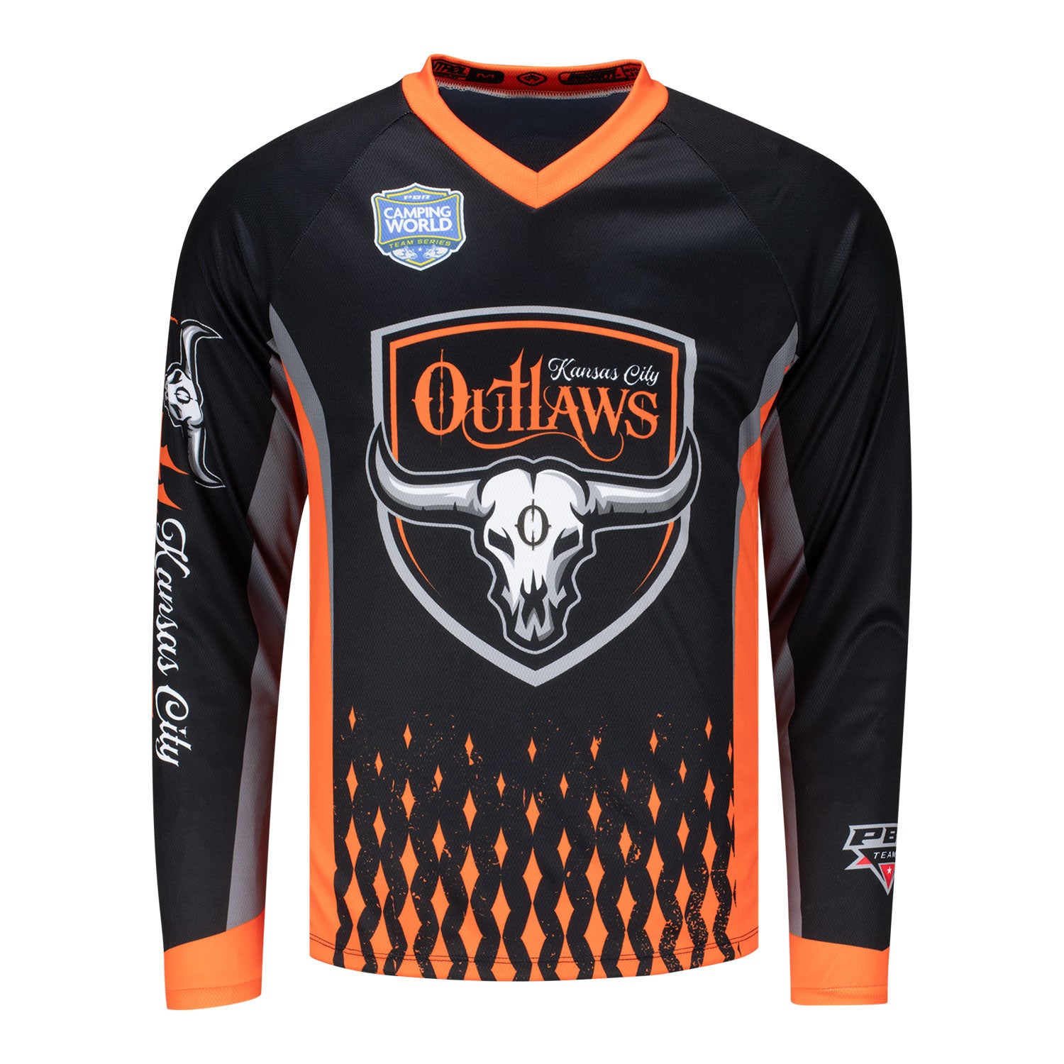 Get ready to ride with style and show your support for your favorite Professional Bull Riding team, the Kansas City Outlaws, with this official PBR Teams jersey. Whether you're a seasoned bull riding enthusiast or watching from home, this jersey is designed for comfort and performance. Join the excitement and represent your Kansas City Outlaws in style this season.